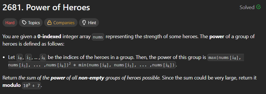 The power of a group of heroes is defined by the square of the maximum strength multiplied by the minimum strength: ``Power = (max)^2 \times min.`` To solve this efficiently, sort the array `[x_0, x_1, \dots , x_{n-1}]` in ascending order. Once sorted, for any subset with minimum index `i` and maximum index `j` `\{x_i , \dots , x_j\}` `(i < j)`, the power is simplified to ``Power = {x_j}^2 \cdot x_i``