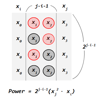 If we fix `x_j` as the maximum, the total power it generates across all possible minimums `x_0` through `x_j` is: ``\begin{align} P_j &= 2^{j-0-1} (x_j^2 \cdot x_0) + 2^{j-1-1} (x_j^2 \cdot x_1) + \cdots + 2^{j-(j-1)-1} (x_j^2 \cdot x_{j-1}) + (x_j^2 \cdot x_j) \\ &= x_j^2 [(2^{j-1} \cdot x_0) + (2^{j-2} \cdot x_1) + \cdots + (2^0 \cdot x_{j-1}) + (1 \cdot x_j)] \end{align}``